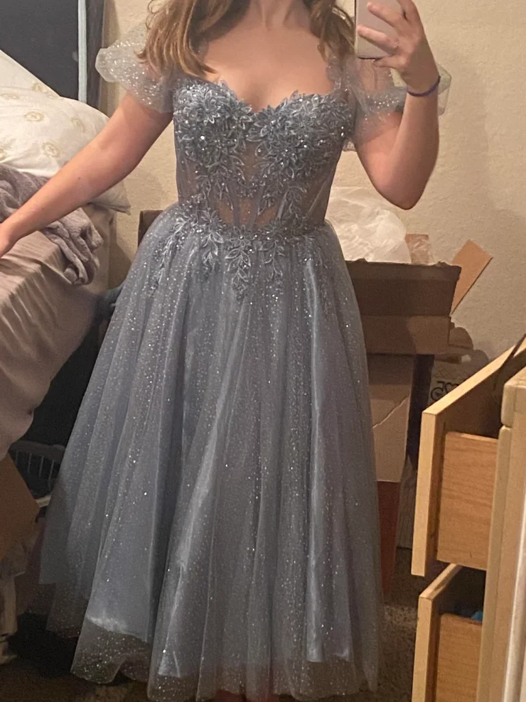 That grey-blue color is giving major Cinderella ballgown vibes without being literal. The all-over sparkle catches light beautifully and creates that enchanted feeling, while the off-shoulder sleeves add romance and femininity. The full skirt creates that classic princess silhouette that makes you feel special the moment you put it on.