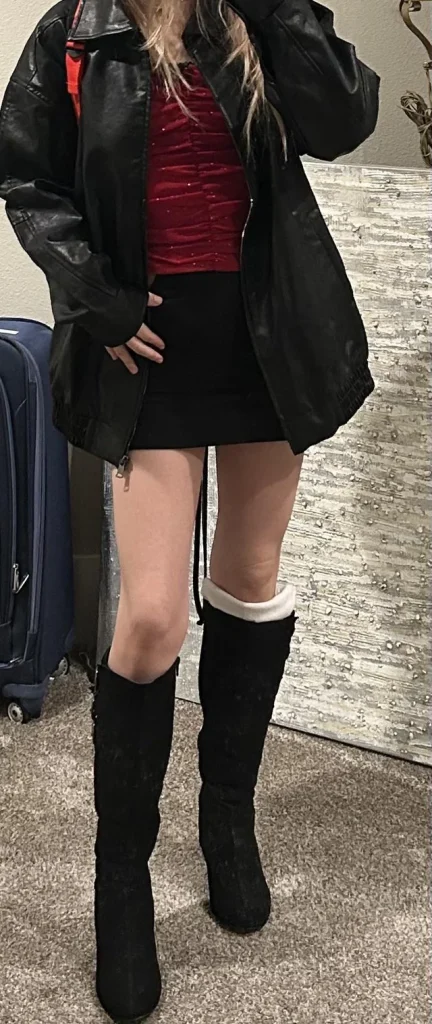 r/Sufficient_Maize_884 proves Disney aesthetic doesn’t have to be all pastels and sweetness with that black leather jacket over a sparkly red ruched top and mini skirt with knee-high boots. This is “what if a Disney princess had a rebellious phase” and I’m absolutely here for it.