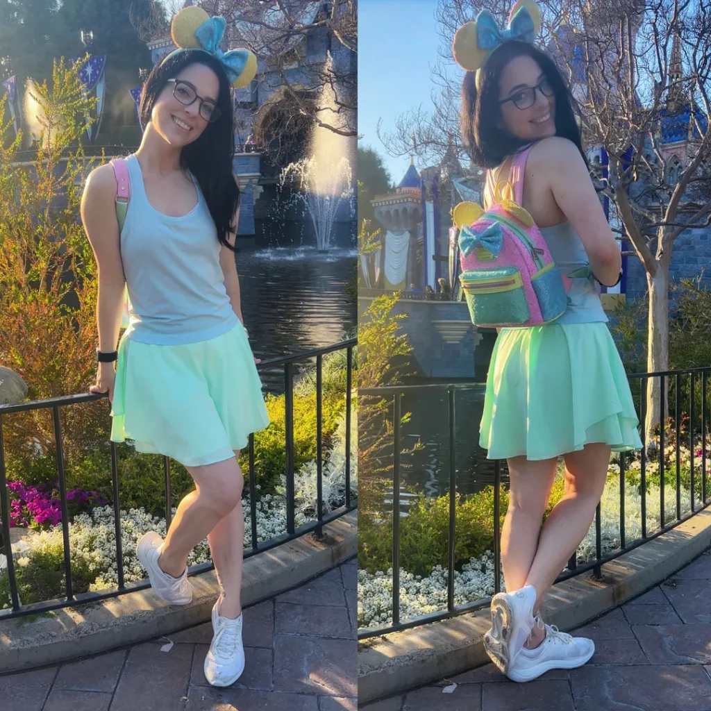 r/vindahlia went full soft Disney magic with that mint skater skirt and white tank top combo, complete with Mickey ears and that rainbow sparkle backpack.