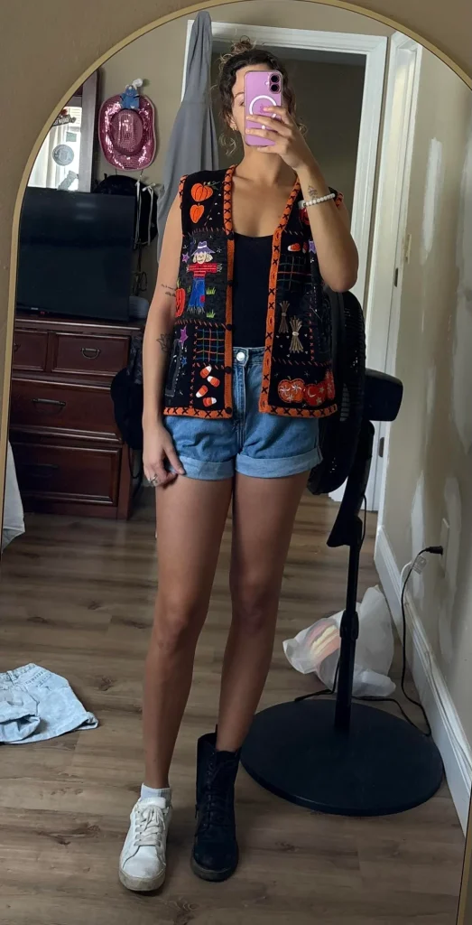 r/BabyV808 shows how to do casual Disney aesthetic with that Halloween-themed vest over a black tank and denim shorts.