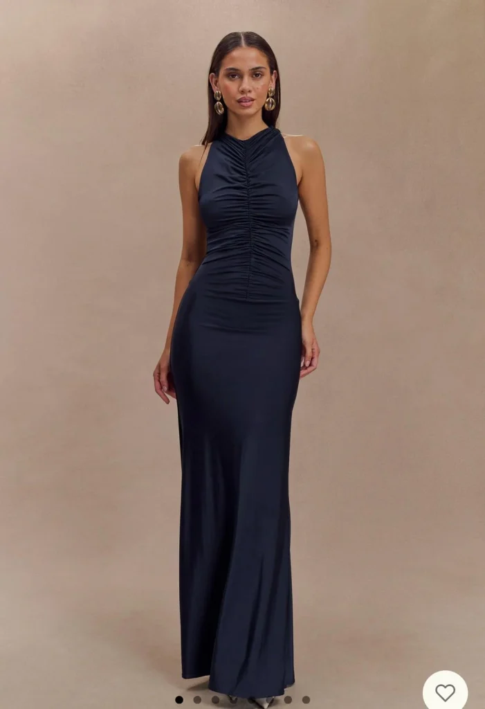 That ruched halter neckline adds texture and visual interest without being over the top. The dress is fitted but not restrictive, elegant but not stuffy. And that navy color? It’s basically the chameleon of formal wear—works everywhere, looks expensive even when it’s not, and flatters literally everyone.