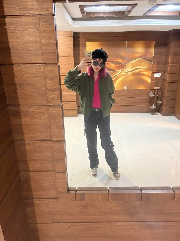 That pop of pink under the muted olive is genius—it shows you put thought into your outfit without screaming for attention. The bomber jacket keeps things relaxed while still providing structure. And those jeans? They’re clearly well-fitted, which is what separates “casual Friday” from “did you just roll out of bed?”
