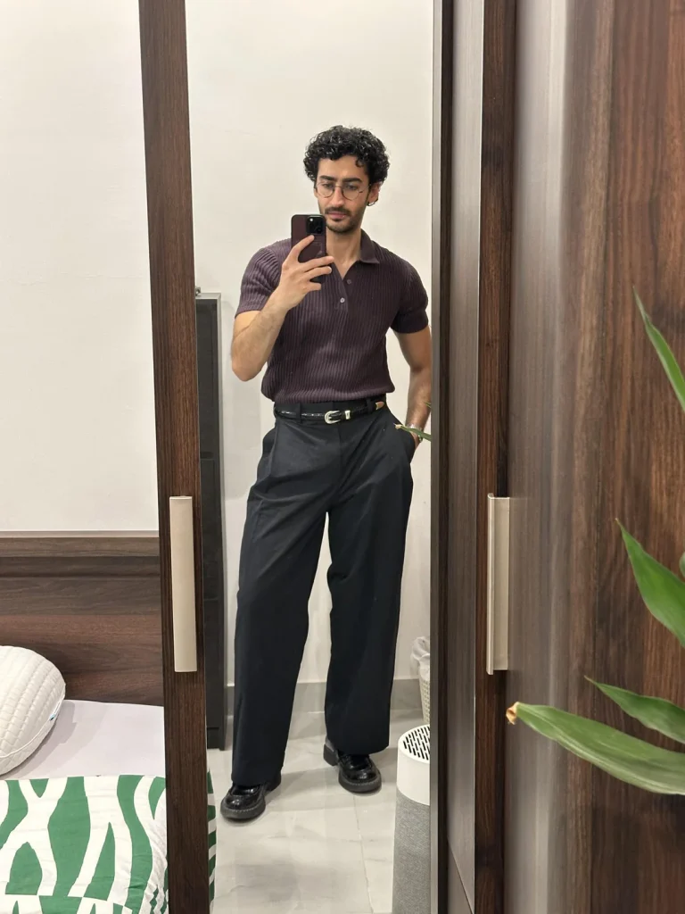 That ribbed texture on the polo prevents it from looking too casual while still being comfortable. Burgundy is one of those colors that feels expensive and intentional without trying too hard. The belt creates definition and adds that finishing touch that separates “wearing clothes” from “wearing an outfit.”