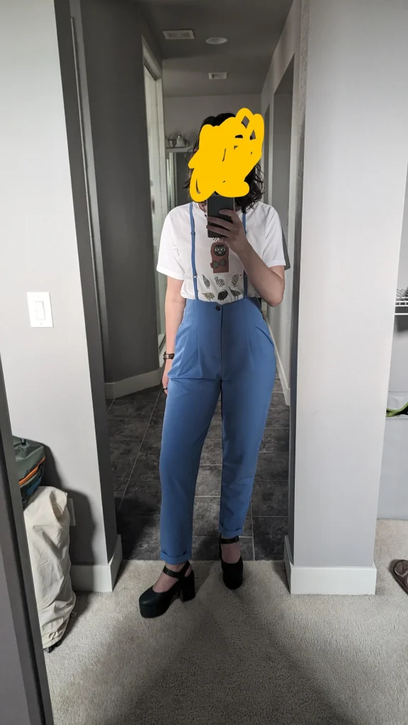 Those blue trousers are clearly the star here—the high waist creates proportion, the color adds interest, and those suspenders? They’re a statement without being costume-y. The white tee keeps things grounded and casual, preventing the outfit from feeling too “look at me.”
