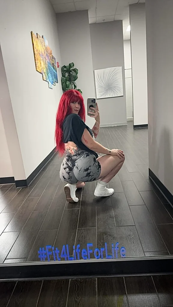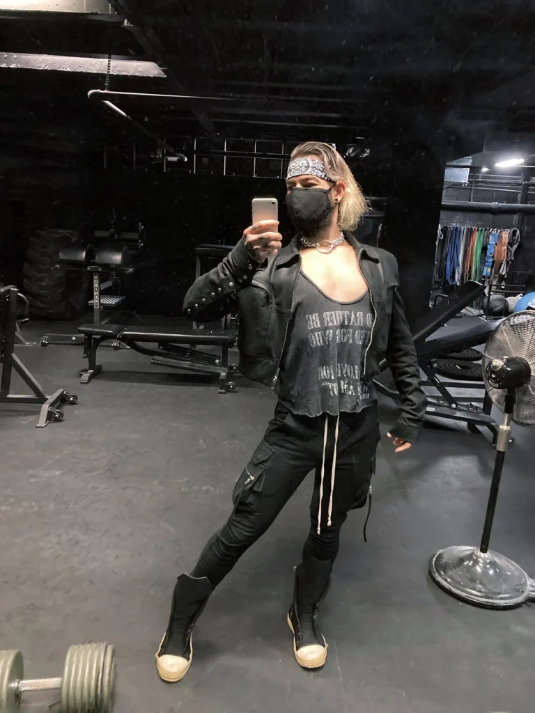 And that hair color? Chef’s kiss. It proves you can have bold hair in unconventional colors and still maintain a minimalist dark gym aesthetic. They complement each other instead of competing.