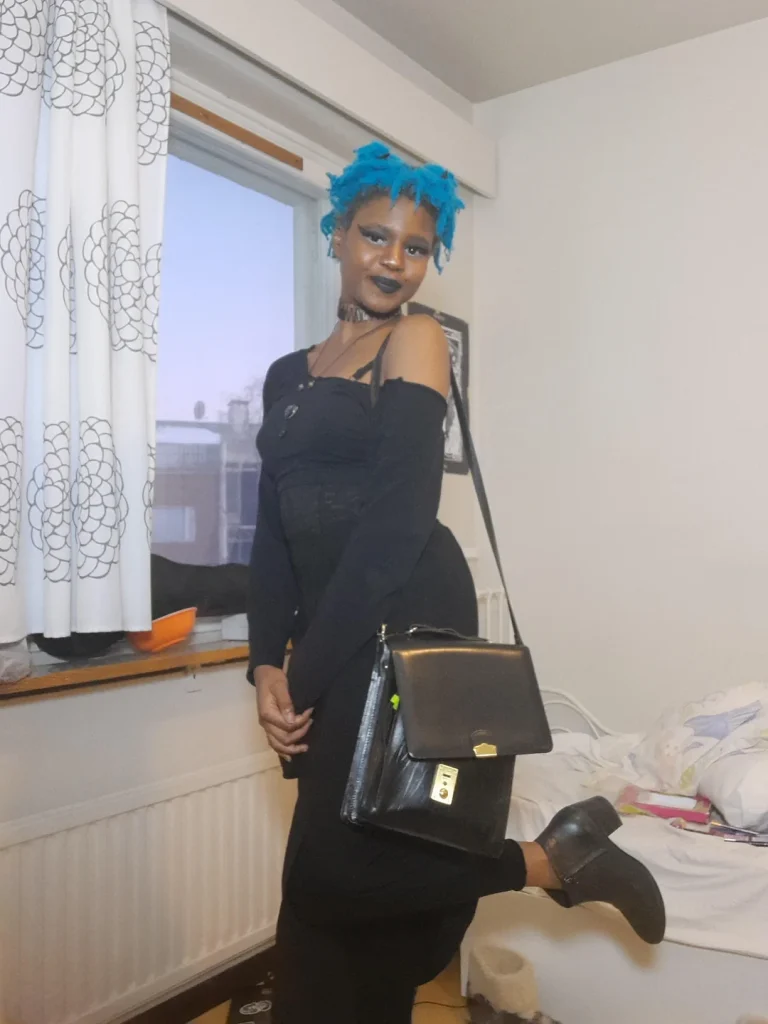r/SnowyFaeryKween proves that all-black everything is a complete vibe with that off-shoulder long-sleeve top, structured bag, and knee-high socks creating serious style points.