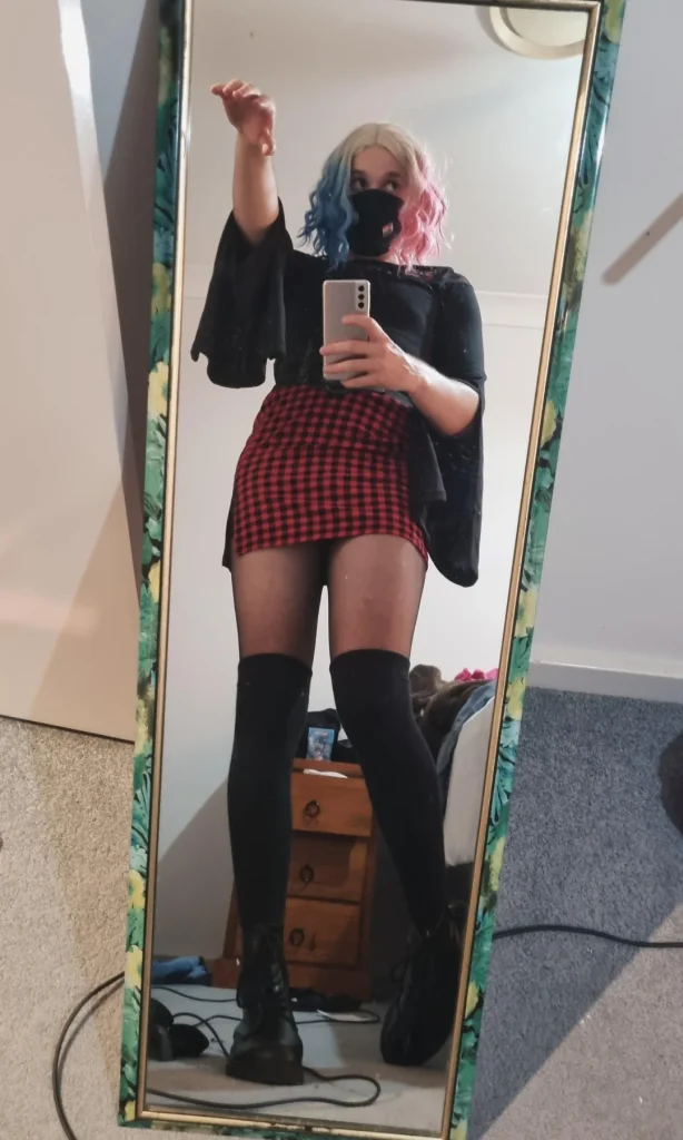 r/AM901 switches it up with blue and pink split-dye hair, red checkered mini skirt, black cape-like jacket, and over-knee boots.