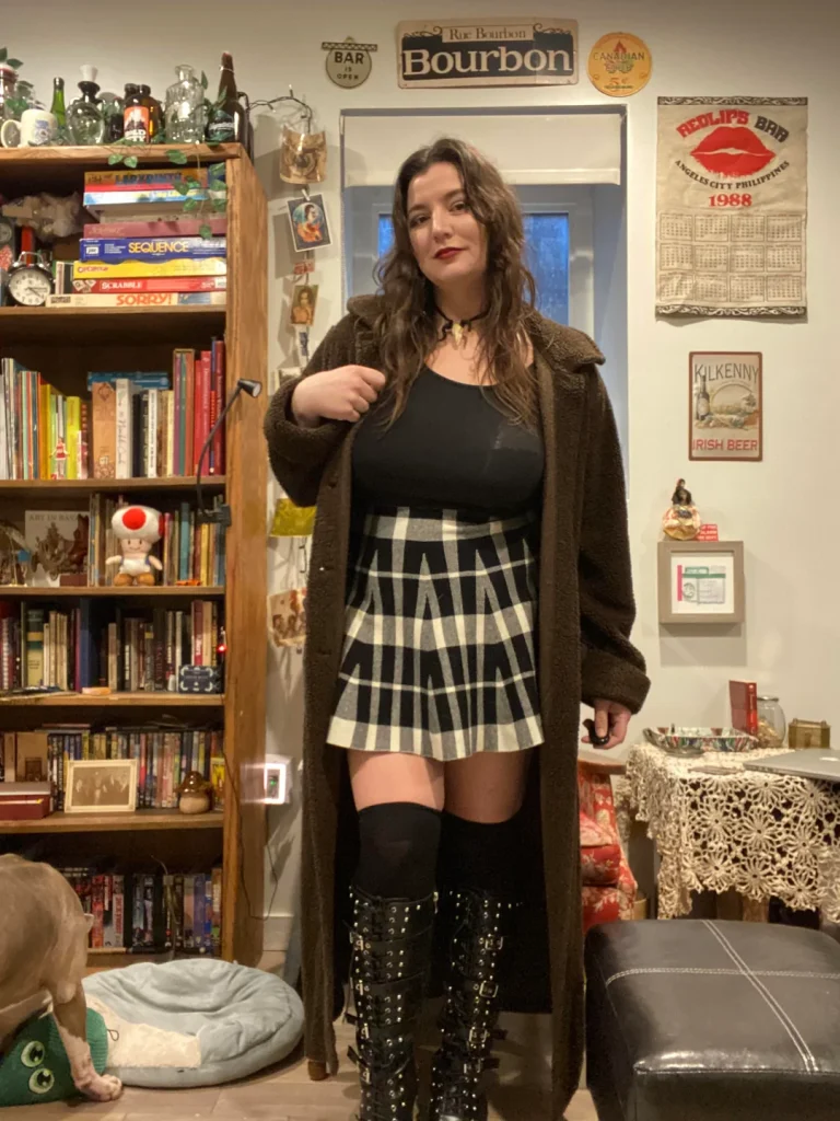 r/momoryah combines comfort and edge with that long brown textured coat over a black top, black and white plaid skirt, knee-high socks, and studded boots.
