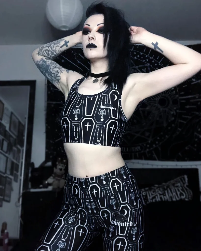 r/WitchOnASkateboard shows that dark gym aesthetics don’t have to be exclusively solid black with that coffin-print matching set.