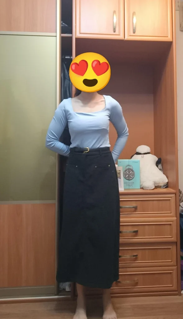 Everything here is basic, but that’s exactly why it works. The blue is soft and approachable. The black skirt is comfortable and forgiving. The belt creates shape so you don’t look like you’re wearing a sleeping bag.