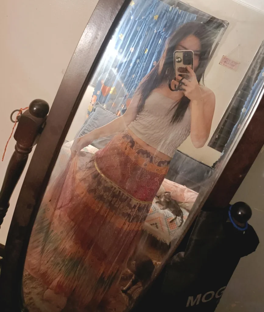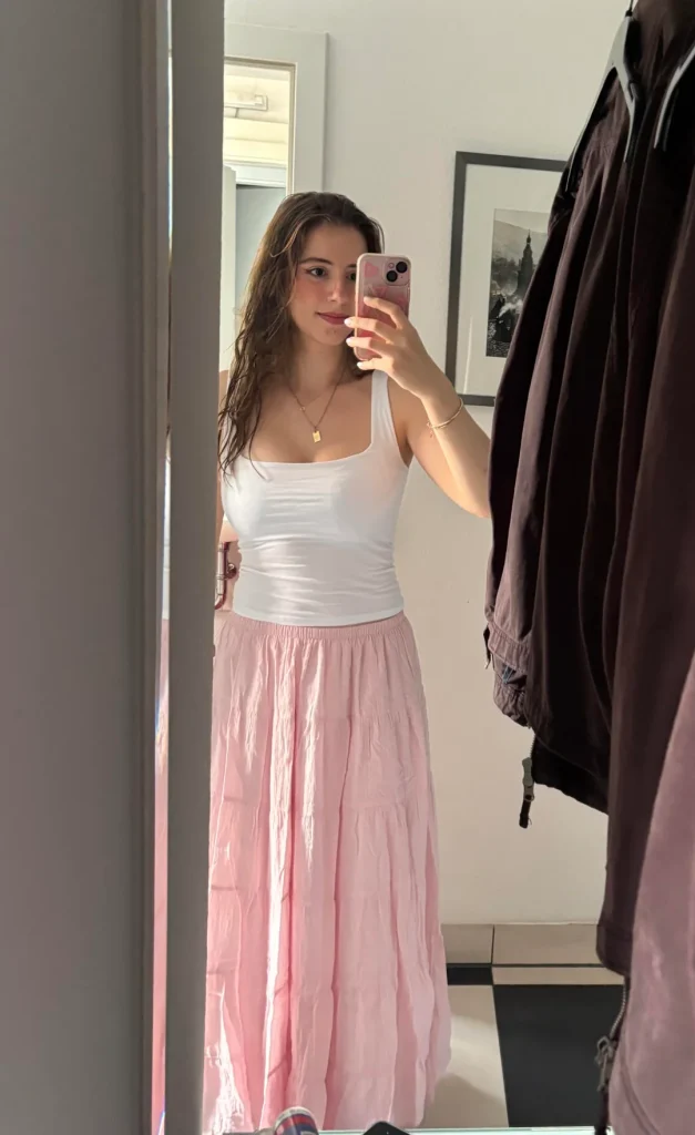 r/mysterious_tiger07 embraces full romantic vibes with that blush pink tiered maxi skirt and white ribbed tank top. This is delicate, feminine, and way easier to pull off than you’d think.