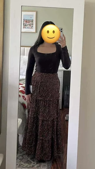 r/decagonic closes it out with a black long-sleeve top tucked into a brown floral tiered maxi skirt. This is autumn energy in outfit form—warm, cozy, and polished.