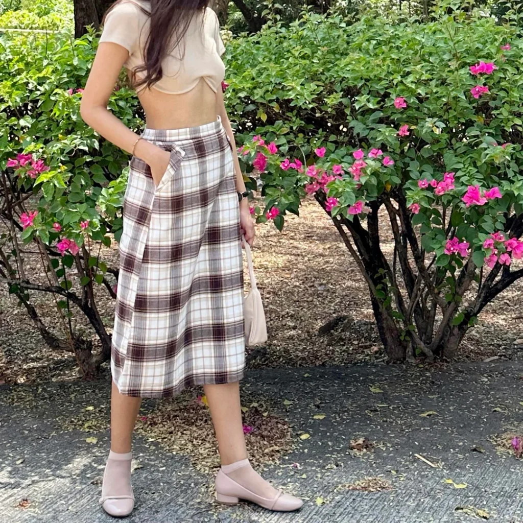 Plaid skirts can go very “school uniform” very quickly, but the midi length and those soft pink flats keep it feeling fresh and feminine. The cream crop top balances the pattern without competing with it.