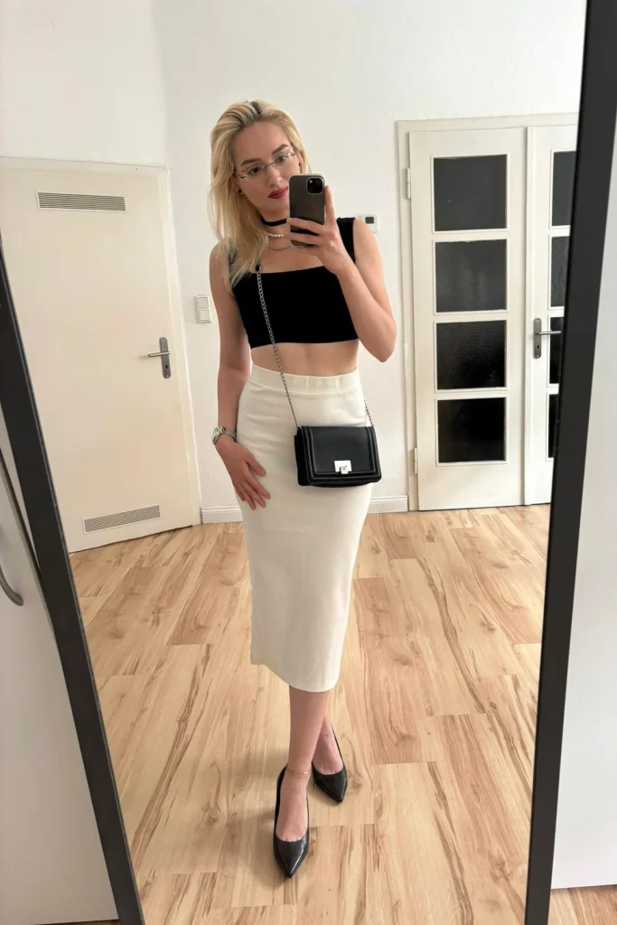 r/Noradrenalin008 shows exactly how to make a long skirt feel elevated with that white pencil maxi, black crop top, choker, and pointed heels. This screams “I’m going somewhere that requires I look like an adult.”
