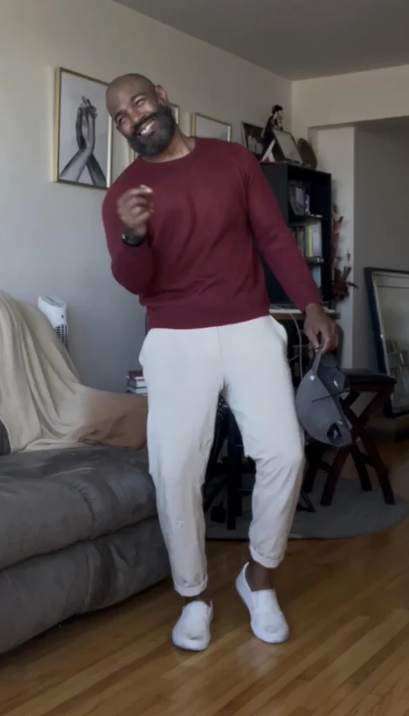 r/SENSEI-D-JOVENES brings warmth and personality with that burgundy crewneck sweatshirt over white pants proof that comfortable and stylish aren’t mutually exclusive. This is the “I’m confident enough to wear light colors” aesthetic, and it works.