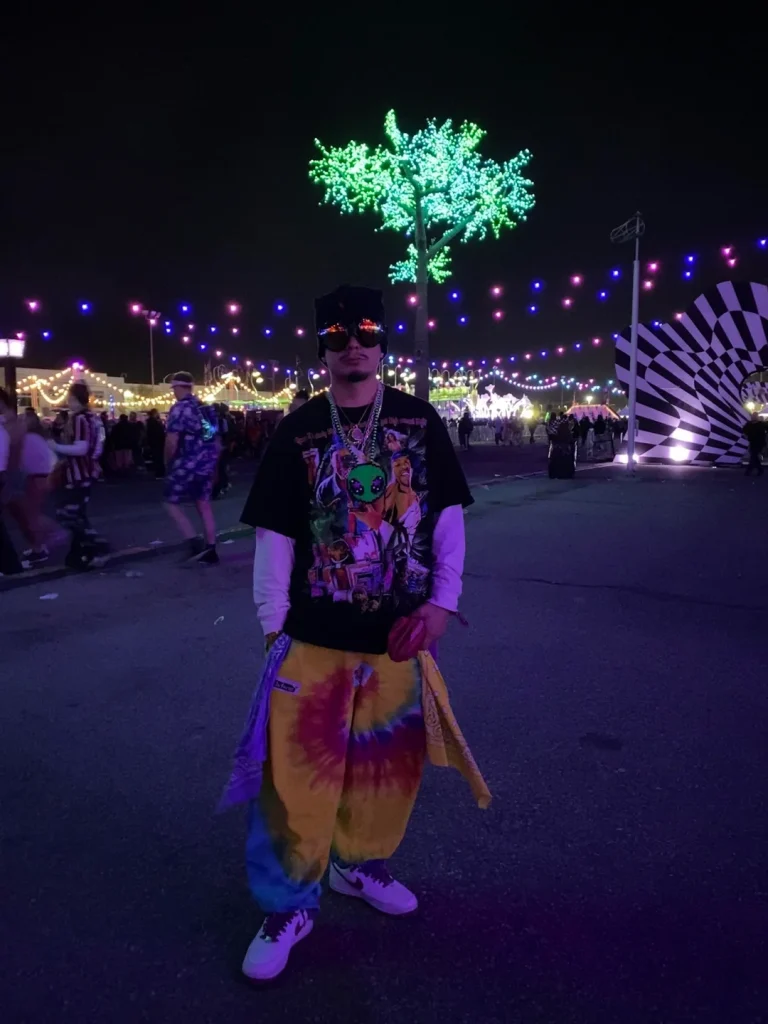 r/MollyPesoOffthetesla went full send with this look at what appears to be a festival or concert, and honestly? Respect. That oversized graphic tee with layered white long sleeves underneath, yellow tie-dye pants, chains, and sunglasses this is personality dialed up to eleven.