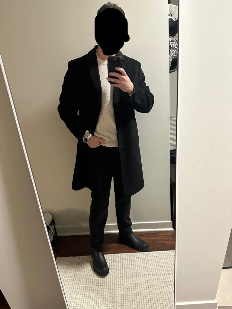 r/StrengthAdept4035 demonstrates why all-black will never go out of style with that black overcoat over a cream knit sweater and black trousers. This is minimalism at its finest the aesthetic of “I understand that great style is about editing, not adding.”