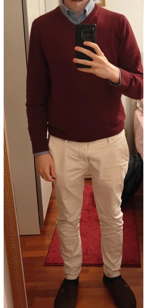 V-neck sweaters over collared shirts are classic for a reason—they work everywhere from actual offices to family dinners where your aunt judges everyone’s life choices. The burgundy is warm without being loud, and that light blue collar peeking out adds just enough contrast.