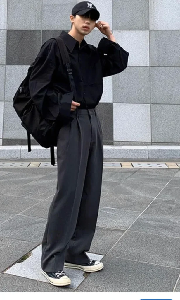 Black-on-black is the cheat code of men’s fashion. When everything’s the same color family, proportions become the star of the show. That oversized shirt creates shape without being baggy, and those wide-leg pants balance everything out so you don’t look like a floating torso.