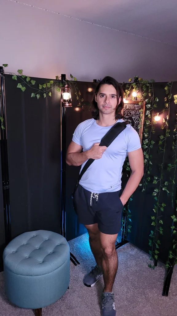 r/Alain_Cortez proves that fitted doesn’t mean uncomfortable with that light blue fitted tee, black shorts, and crossbody bag setup. This is “I take fitness seriously but I’m still chill” vibes.