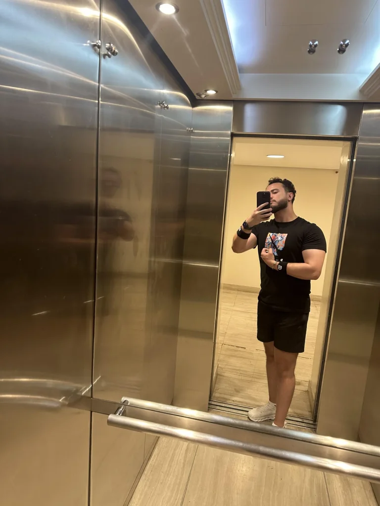 r/Straight-Status-4365 proves that monochrome muscle-fit works with that black graphic tee and black shorts in an elevator mirror. This is sleek, simple, and lets your physique do the talking.