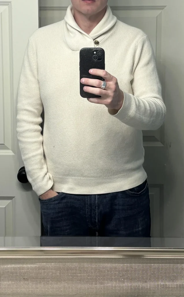 r/cmdrico7812 takes gym wear up a notch with that cream shawl-collar knit sweater over dark jeans. This is “gym-adjacent sophistication” that works for events at fitness spaces.