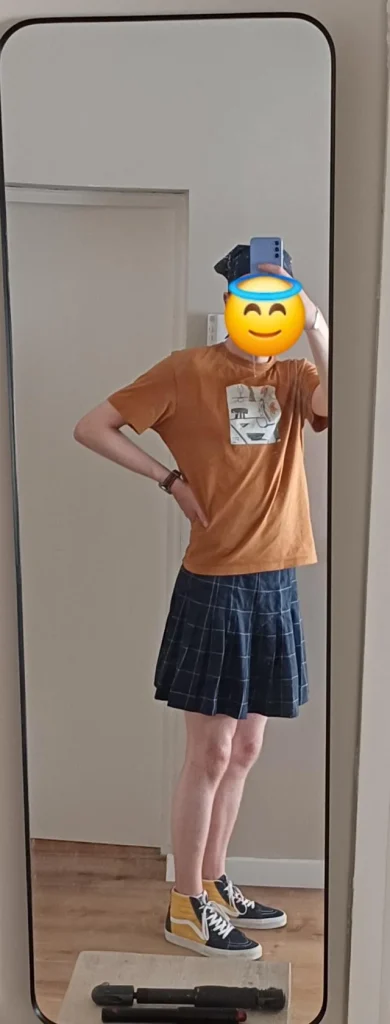 r/Diligent_Trouble_531 proves that sometimes simple is best with an orange graphic tee tucked into a navy pleated skirt and Vans. This is casual confidence at its finest.