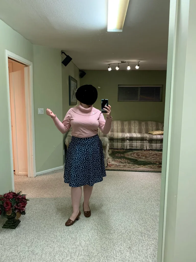 r/BangtanPHD_ keeps it sweet and feminine with a dusty pink turtleneck and a navy polka dot skirt. This combination is soft, flattering, and timelessly feminine.