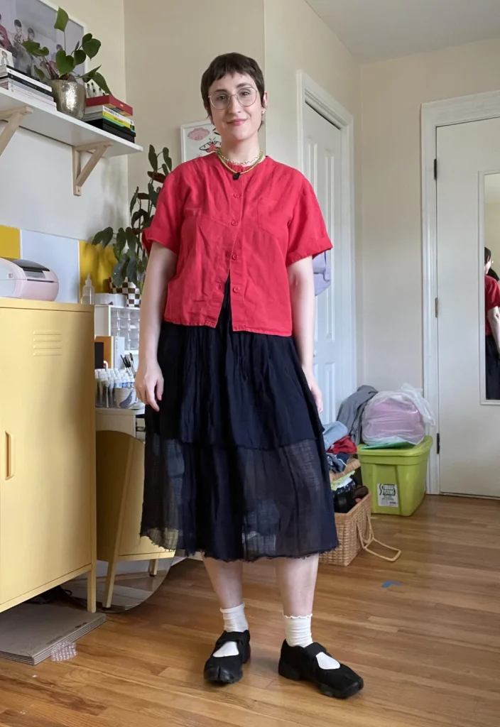 r/oh_avalanche goes bold with a coral-red button-up shirt over a tiered navy midi skirt and T-strap shoes. This is artistic, unique, and full of personality.