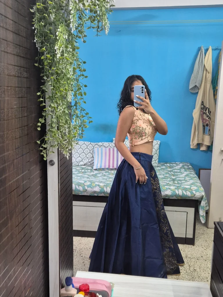 That intricate embroidery on the crop top paired with the flowing navy skirt creates a look that’s perfect for weddings, cultural events, or any occasion that calls for something special.