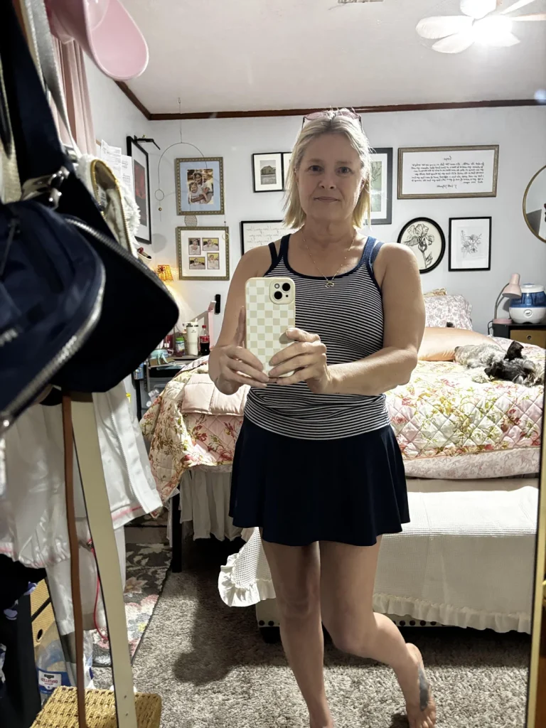 Stripes and navy are like peanut butter and jelly they just work. That tucked-in tank creates a clean silhouette, and the skater skirt style is forgiving, comfortable, and still looks intentional.