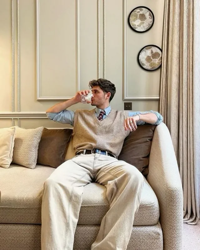 r/decadeology delivers textbook prep-school-kid-all-grown-up vibes with that layered sweater vest over dress shirt with tie and cream trousers. This is old money at its most traditional, but it works because every single detail is intentional.