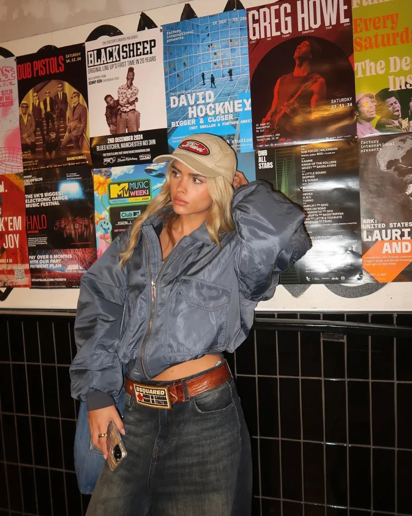 r/womensstreetwear brings edge to old money with that navy bomber jacket, designer belt, baseball cap, and jeans. This is what happens when old money meets streetwear—and somehow it totally works.