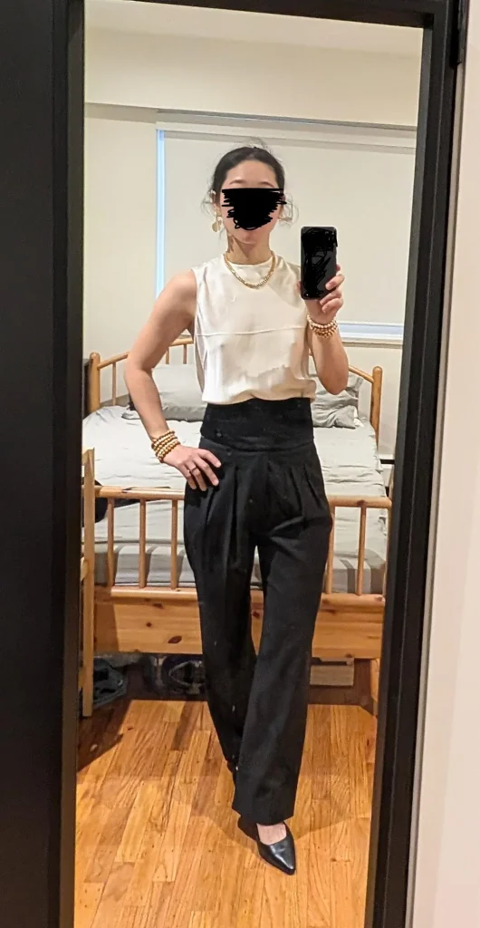 r/fashion shows that sometimes the simplest combinations hit hardest with that white sleeveless top, black tailored trousers, and statement gold jewelry. This is minimalism with personality—clean, classic, and completely confident.