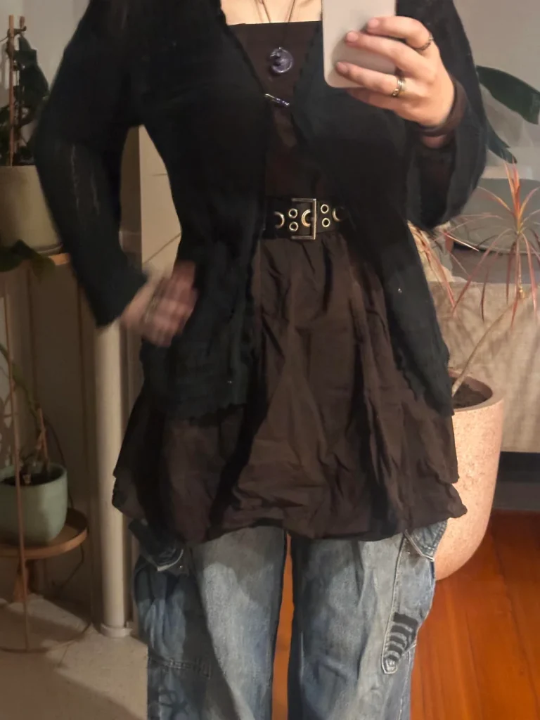 r/DeepTadpole6288 goes maximalist with that black vest top over a patterned skirt and baggy wide-leg pants, with a crossbody bag completing the look. This is “more is more” styling, and sometimes that’s exactly what you need.