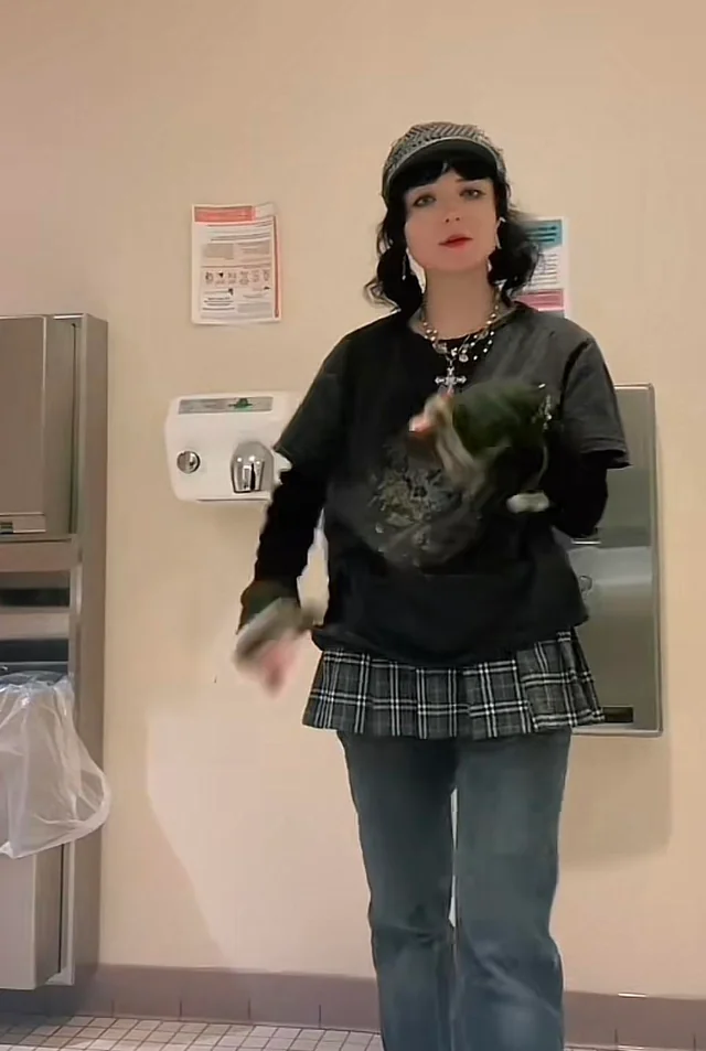 r/JuneSnowpaw channels punk-rock vibes with that red and black plaid pleated skirt over distressed jeans. This is Hot Topic meets 2024, and it’s working harder than it has any right to.